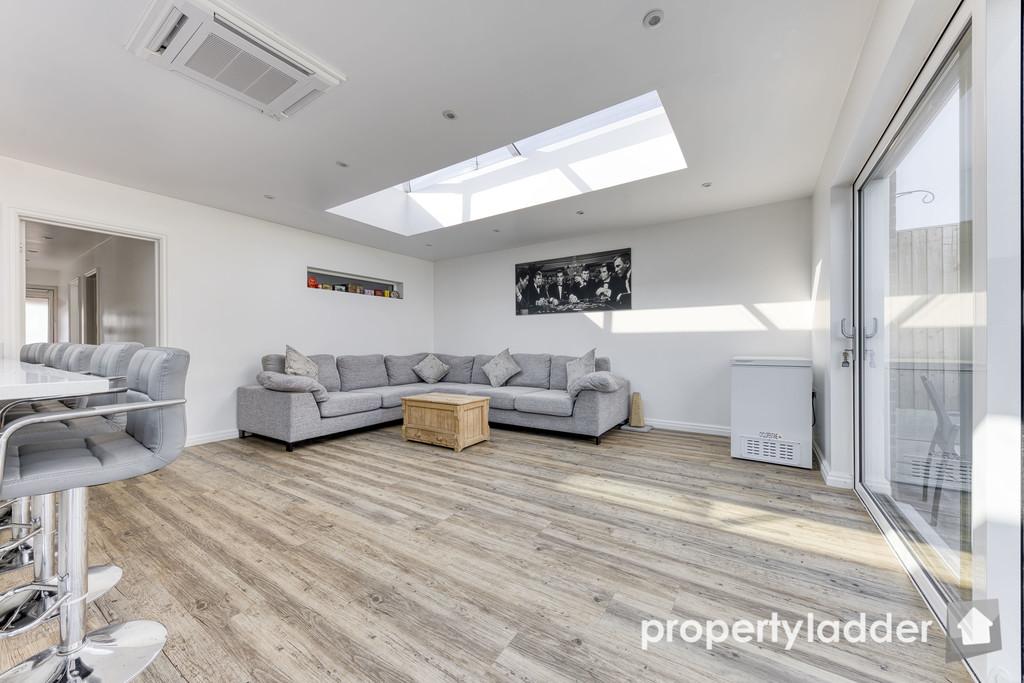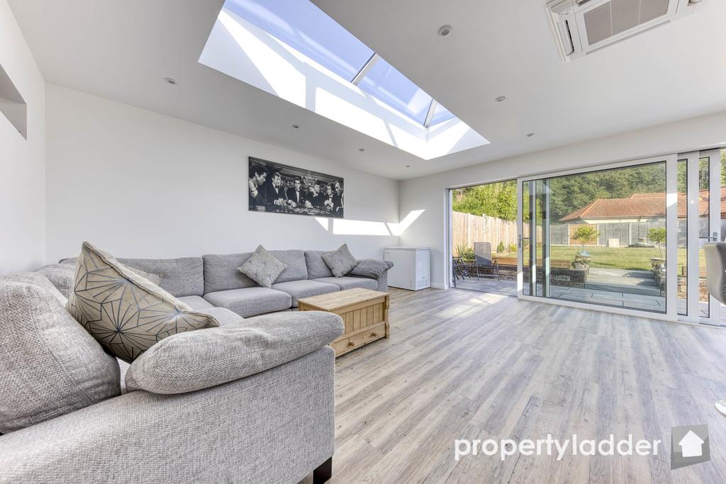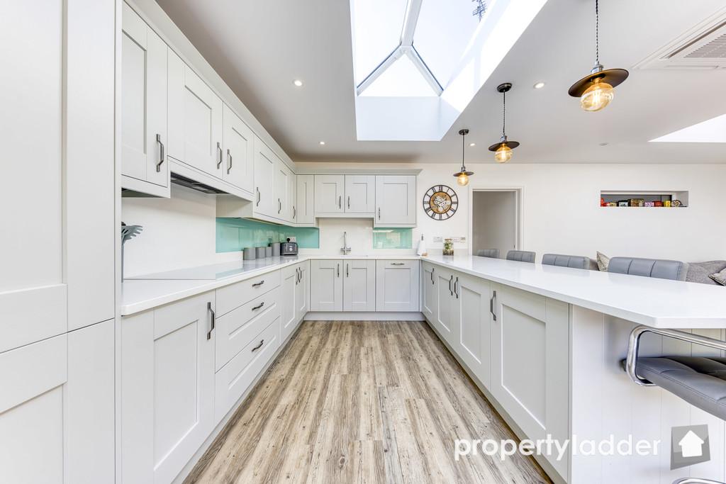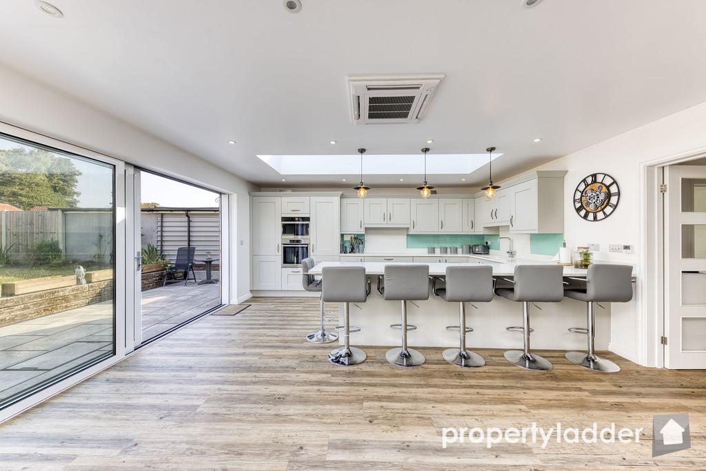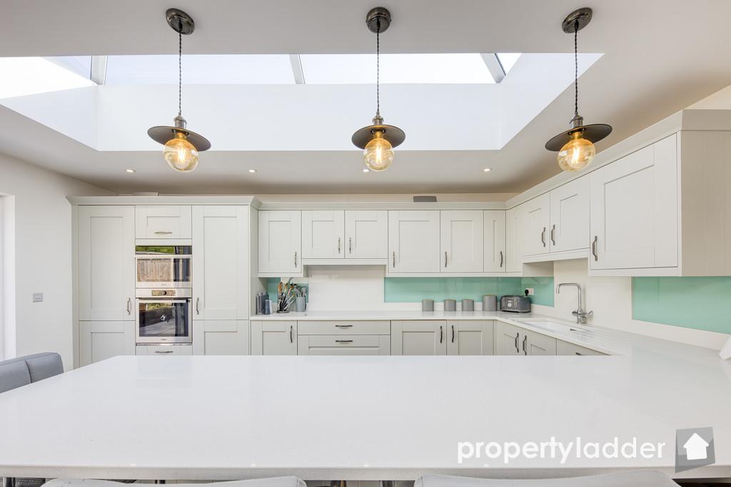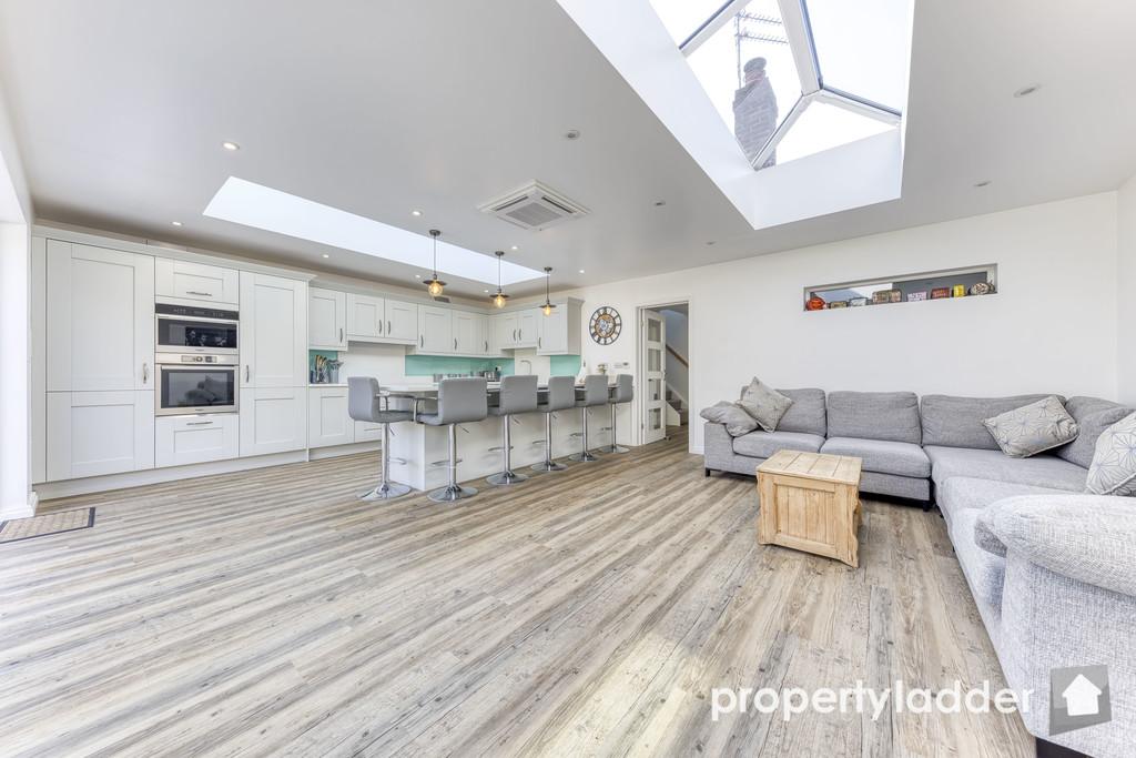 Kitchen/Family Room: 7.26m x 5.35m. A gorgeous family space flooded with light from the roof lanterns and huge triple sliding doors. With gorgeous quartz worktops, integrated fridge, freezer, washing machine, dish washer, double oven, large induction hob, sink with boiling water tap and dining/breakfast bar.