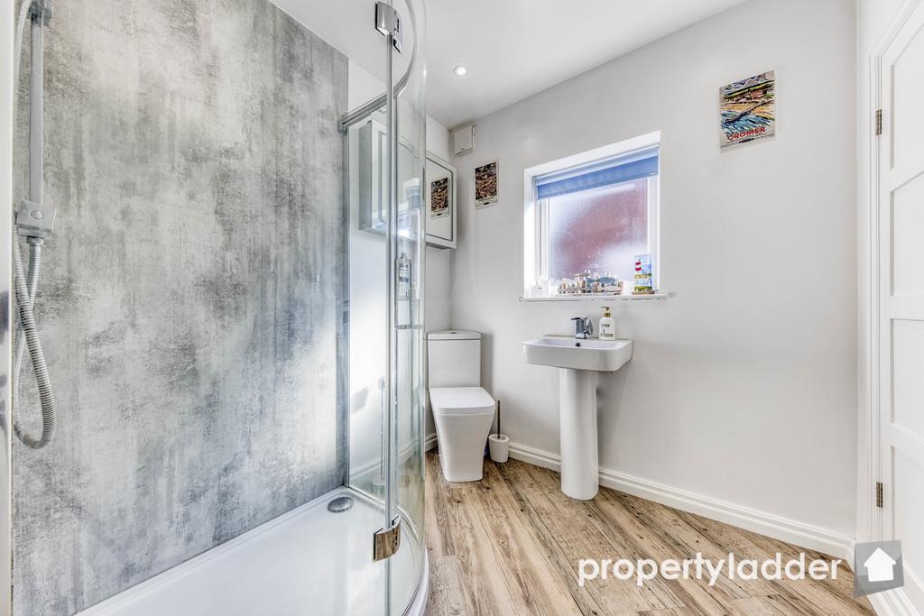 Shower Room: 2.14m x 2.10m. Shower, WC, sink and door to storage under the stairs.