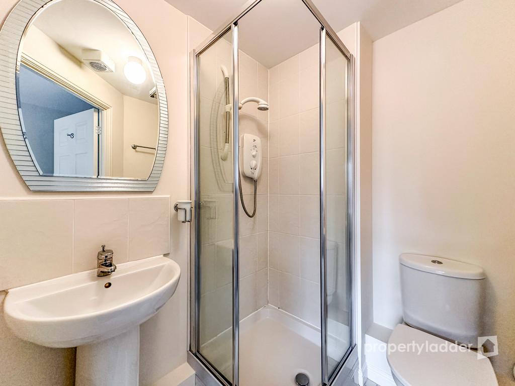 En suite Shower Room 2' 5" x 5' (0.74m x 1.52m) A white three-piece suite comprising shower cubicle, low level WC, wash hand basin, tiled floor, radiator, extractor fan.