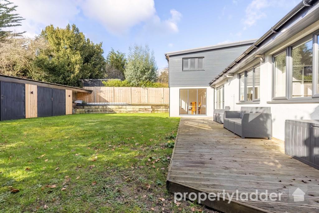 To the rear, the garden continues to impress with an expansive, enclosed lawn bordered by mature hedging and smart timber fencing for maximum seclusion. A large raised decked terrace provides an inviting space for outdoor entertaining, al fresco dining, or simply relaxing with a good book. There's also a substantial outbuilding, ideal for storage or as a potential workshop or garden studio.