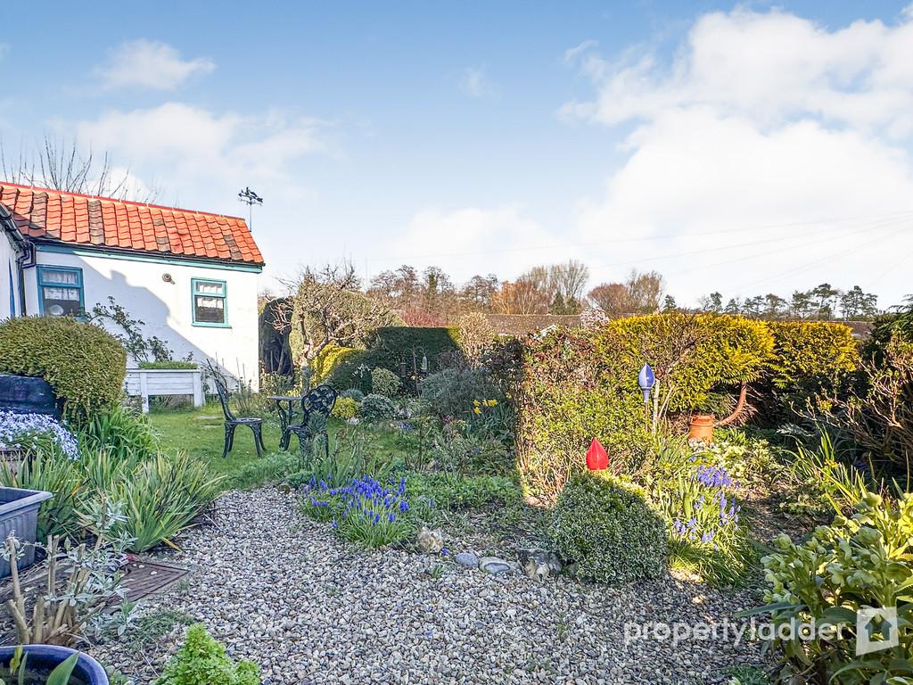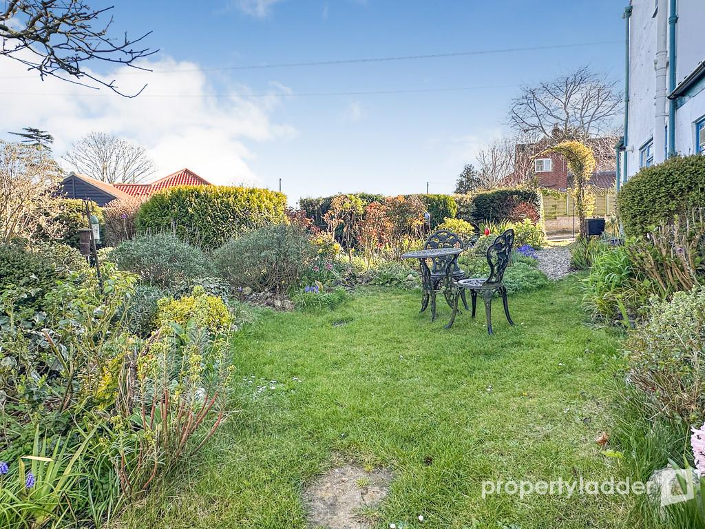 main areas. Immediately to the rear, a well-kept lawn is bordered by vibrant, mature planting that adds colour and seasonal interest. To the side, another generous lawned section continues the theme, with an abundance of shrubs and flowers creating a peaceful, private outdoor space.