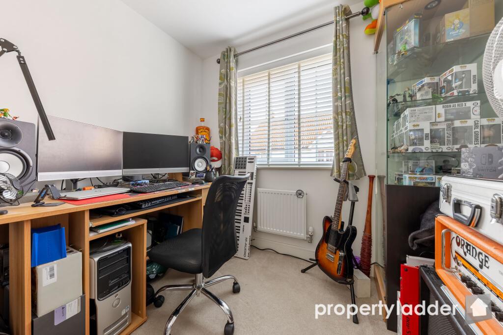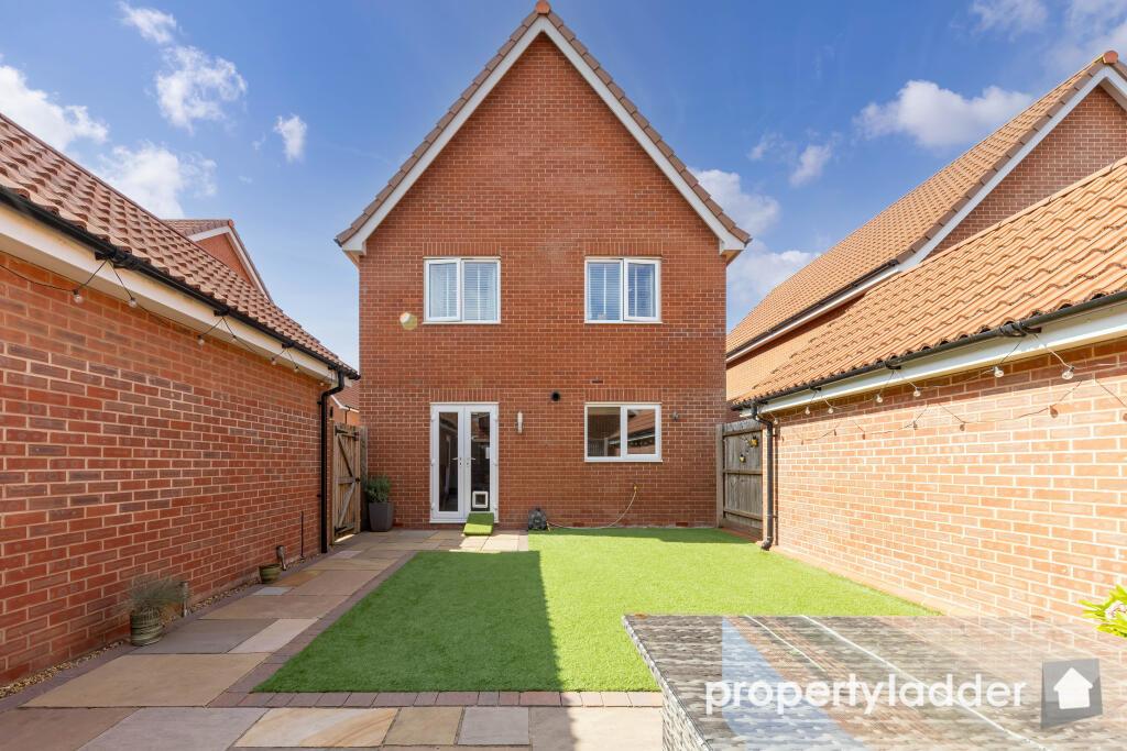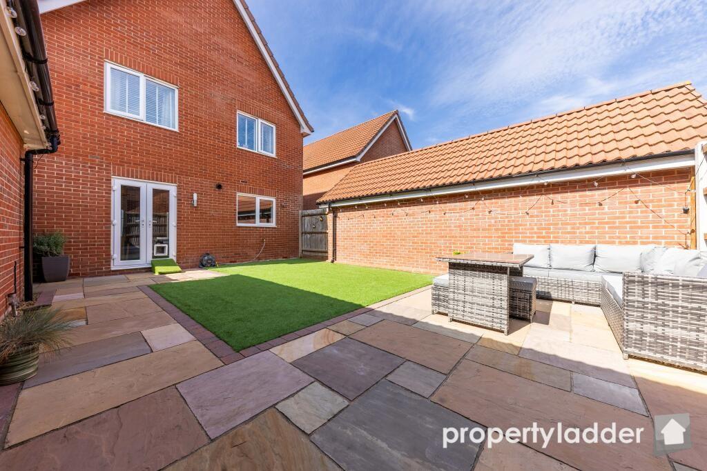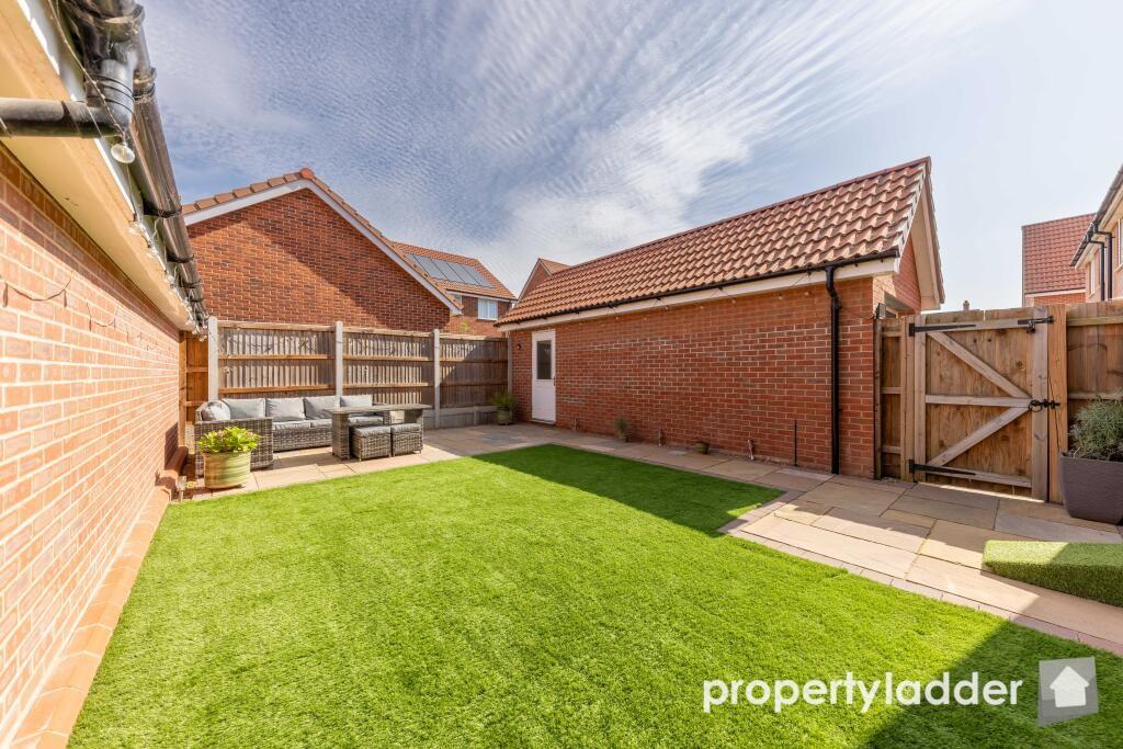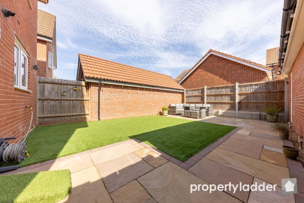 The rear garden offers a private, enclosed space for relaxing and entertaining, with an artificial lawn and patio area ideal for summer dining.