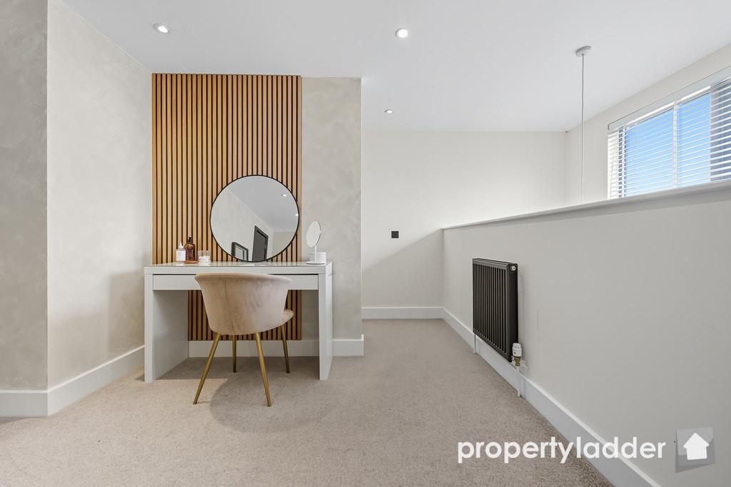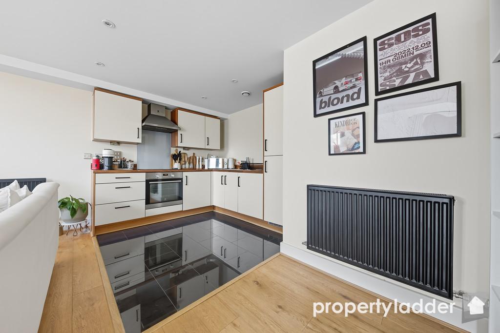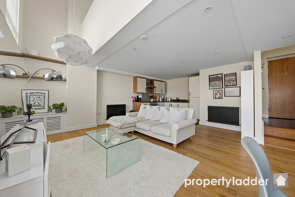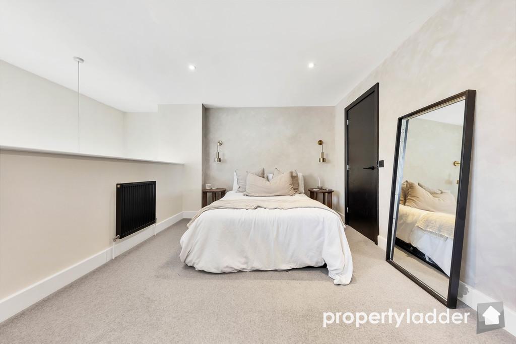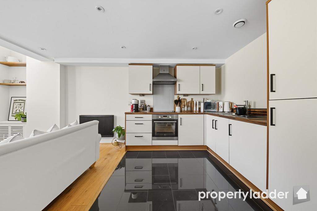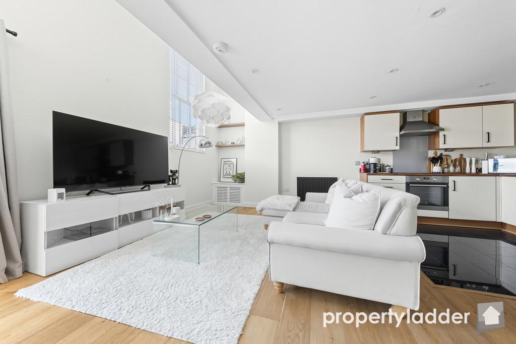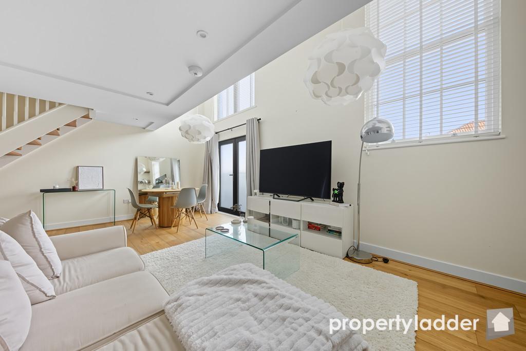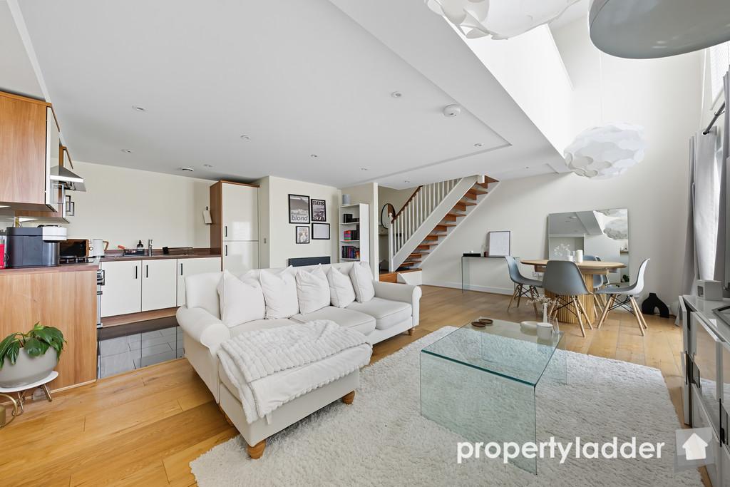 Situated on the ground floor, the property offers modern open plan living accommodation, combining the sitting and dining area with a well-appointed kitchen. A staircase leads to the impressive mezzanine bedroom, which features a galleried aspect overlooking the living space, along with an en-suite shower room and a large walk in wardrobe. Two large windows, together with French doors, flood the living space with natural light and create a bright, airy atmosphere.