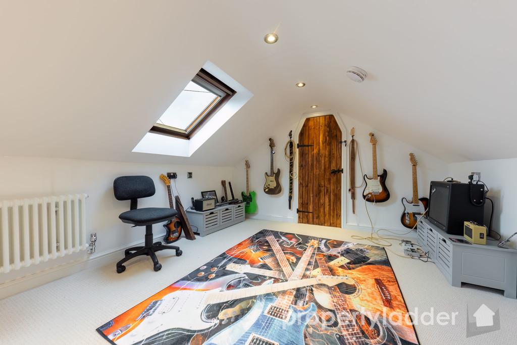 The accommodation is thoughtfully arranged and comprises an entrance hall leading to a modern kitchen with island, integrated appliances and underfloor heating, which in turn provides access to a large entrance porch and a substantial utility room with additional worktop space and housing the boiler. The living room is located to the rear of the property and features a striking multi-fuel woodburner, opening through to a large conservatory that enjoys exceptional views across the garden. The bungalow offers two well proportioned double bedrooms, with the principal bedroom benefiting from an en-suite shower room with underfloor heating, in addition to a study or further reception room and a family bathroom. Stairs lead to a useful attic room complete with heating, spotlights and Velux windows, alongside eaves storage and a further large storage cupboard, providing valuable and versatile additional space!
