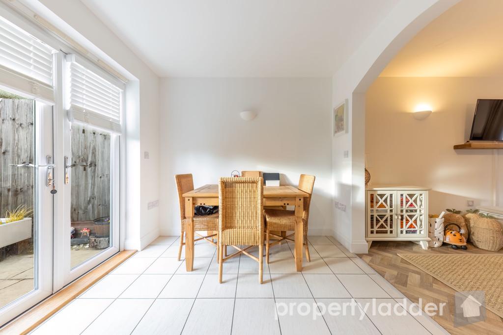 The property opens into a welcoming entrance hall with a ground floor WC and benefits from underfloor heating throughout the ground floor. To the front is a light and airy living room, while to the rear sits a well-designed open-plan kitchen dining room, ideal for modern living and entertaining. Double doors open directly onto the rear garden, creating a seamless connection between indoor and outdoor space. A number of the kitchen appliances will remain, adding further appeal for buyers.
