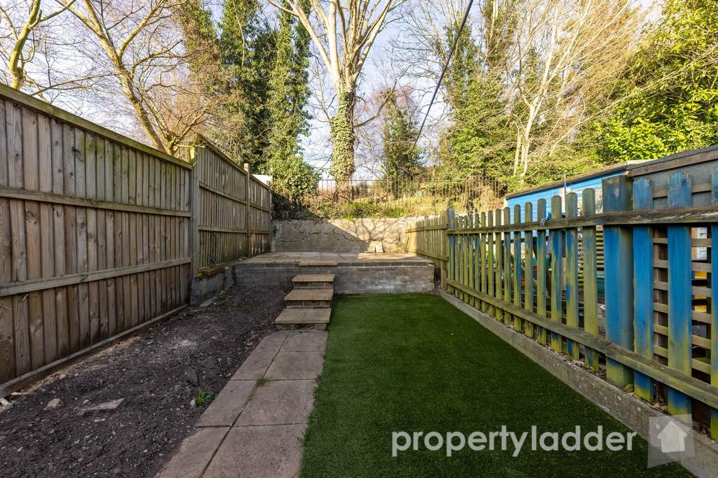 The rear garden proves a stand out feature of the house, and has been thoughtfully arranged to provide a low maintenance outdoor space ideal for relaxing and entertaining. A paved patio area extends directly from the property, leading onto a section of artificial lawn and a pathway that continues towards the rear of the garden. At the back, a raised patio area creates a fantastic spot for seating, enjoying excellent sunshine throughout the day and making the most of the leafy green backdrop of mature trees and planting beyond, which provides a pleasant sense of privacy and greenery. The garden is fully enclosed with fencing and also benefits from useful outdoor storage.