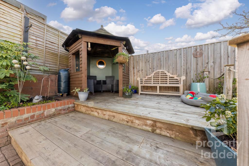 The rear garden has been thoughtfully landscaped and cleverly divided into distinct areas to suit all occasions. A lawned garden with raised beds leads to a beautiful corner decked seating area, ideal for relaxing in the sun. A separate patio area with a summer house and gazebo creates the perfect setting for entertaining, barbecues and social gatherings, with easy access to both the home office and garage.