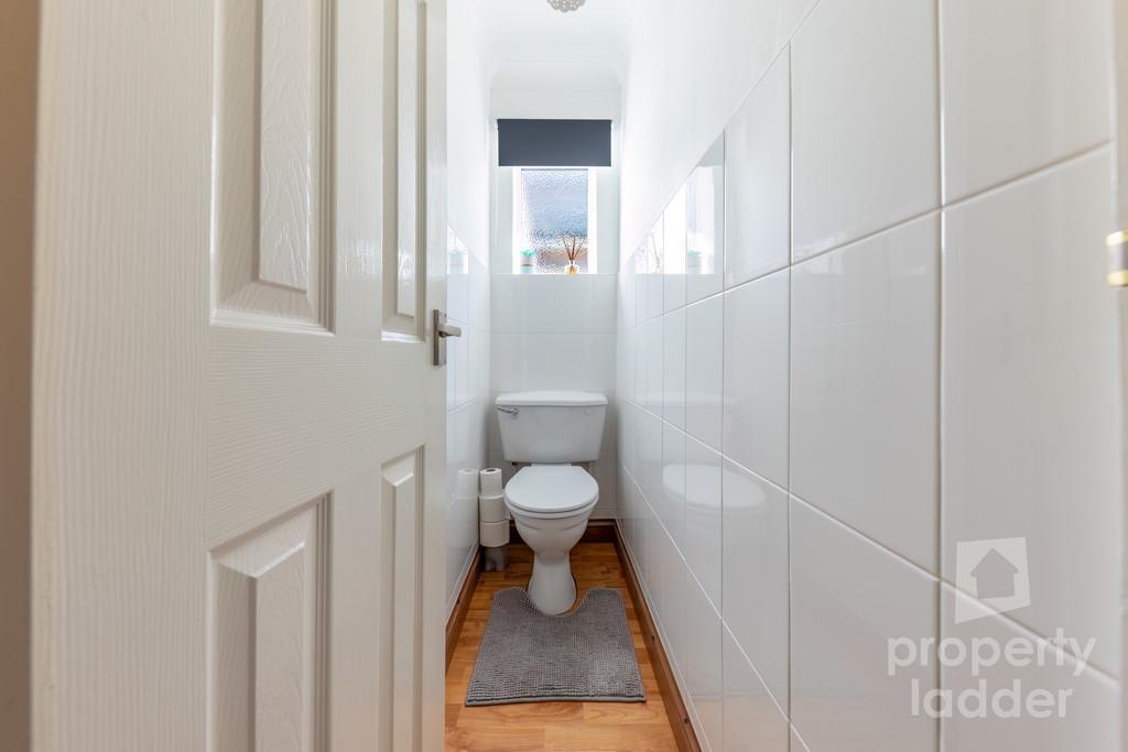 There are three well-proportioned bedrooms, with the principal bedroom benefiting from a walk-in wardrobe complete with fitted storage, adding a touch of luxury and practicality. The family bathroom is finished to an excellent standard, featuring both a separate bath and shower enclosure, along with fitted cabinetry, while a further WC adds additional convenience.